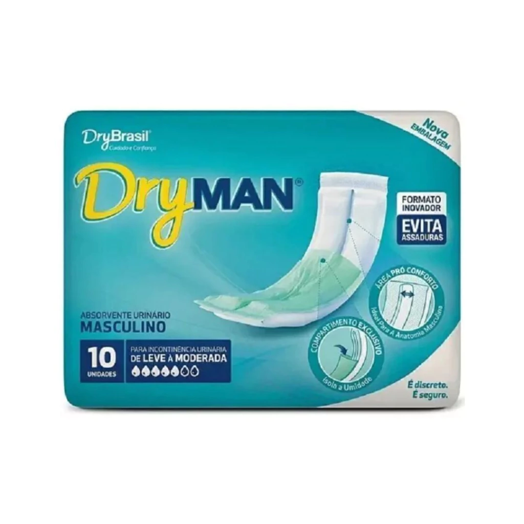 Absorvente Dryman Masculino, com 10 unidades, foi projetado para homens com incontinência urinária leve à moderada. Discreto e seguro, foi desenvolvido especialmente para se adequar à anatomia masculina e com um compartimento que isola a umidade, oferecendo mais conforto e segurança.
