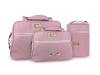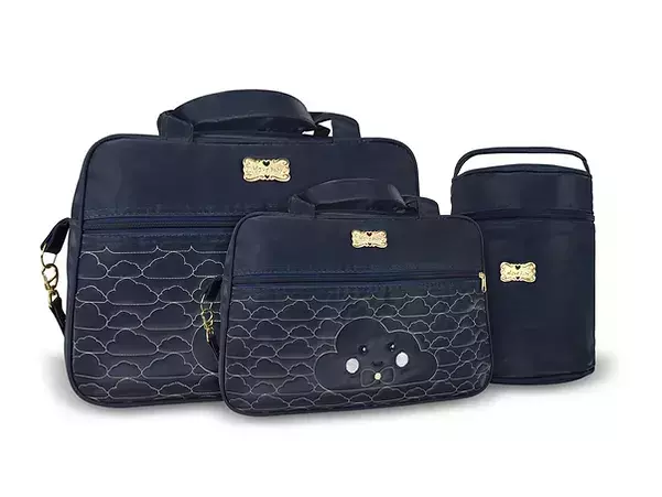 Kit bolsa 4 peças, contendo: 1 bolsa, 1 frasqueira (tipo mala), 1 porta mamadeira térmico e 1 trocador impermeável. Possuem fechamento principal em zíper, 01 bolso frontal com fechamento em zíper. Ambas com 2 alças de mão laterais e 1 alça de ombro (removível apenas de um lado, o outro é costurado). As cores dos produtos podem sofrer variações em função da diferença entre monitores e resoluções.