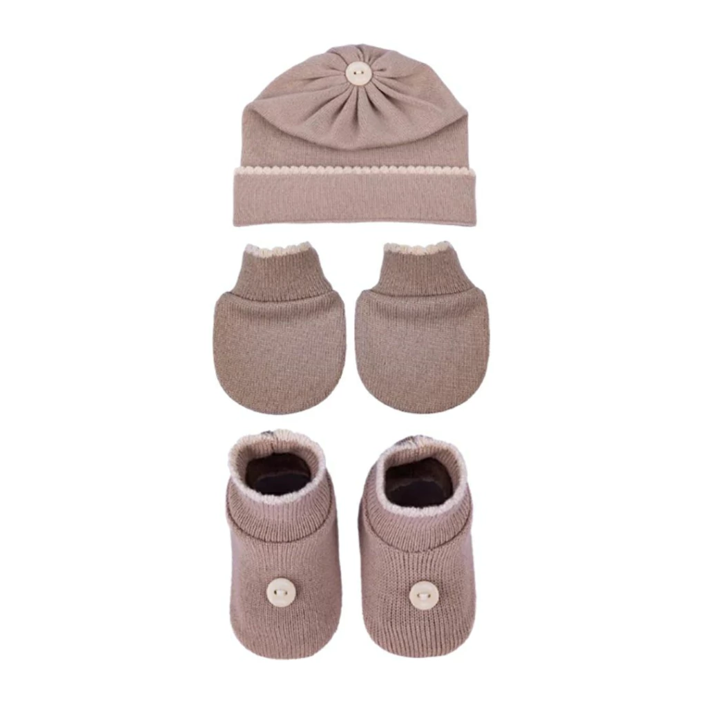 Perfeito pra você que já tem um body ou um conjuntinho e quer completar o look com acessórios confortáveis e que protegem as mãozinhas, pezinhos e cabecinha do seu baby.