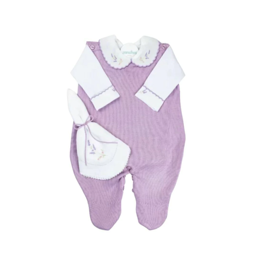 Ele é composto por 3 peças: Body com um bordado exclusivo e delicado, macacão leve e prático, com botões que facilitam as trocas, e um paninho de boca prático e charmoso!