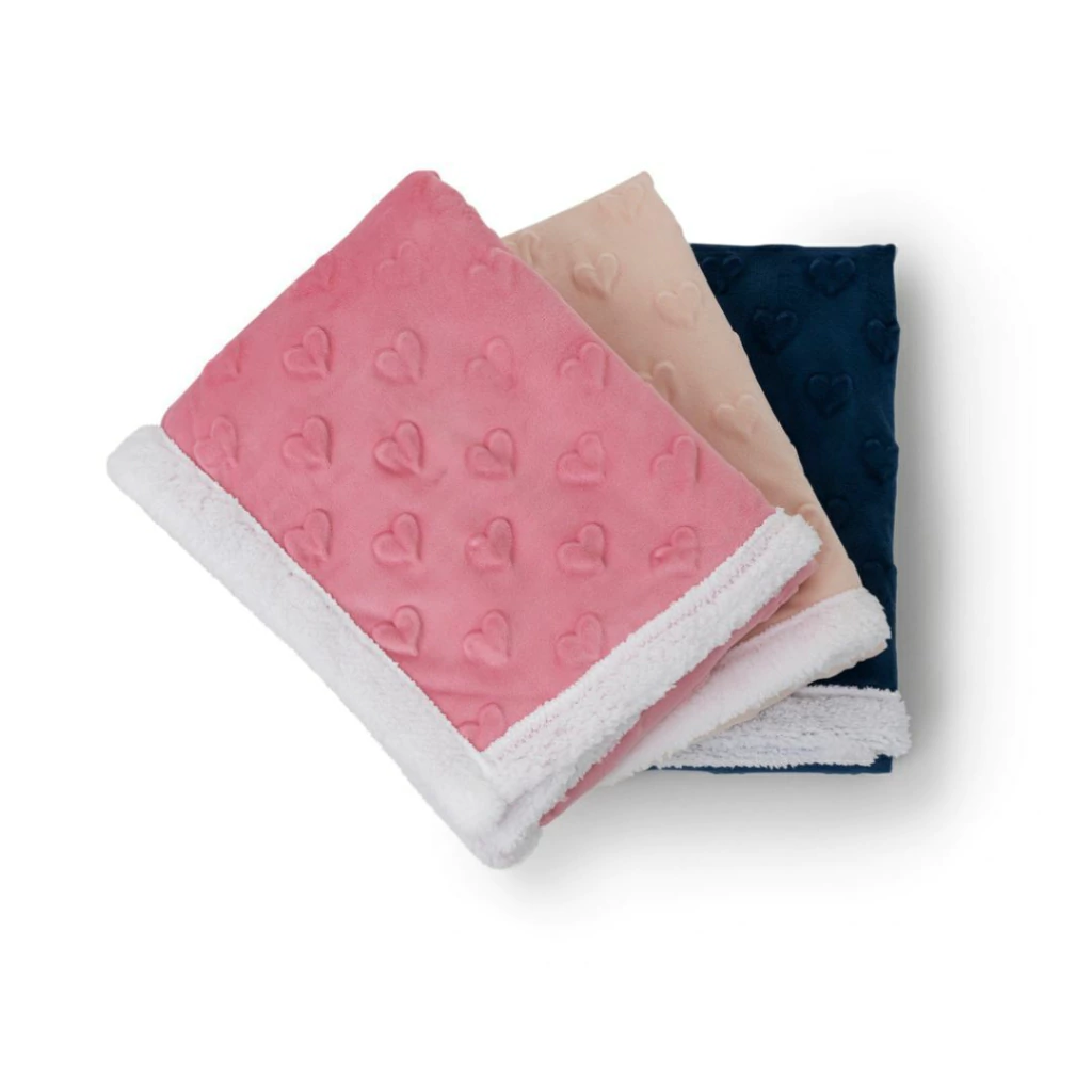 Oferece uma combinação de conforto, beleza e proteção para nossos nenéns. O cobertor é dupla face: um lado é de microfibra macia com corações aconchegantes em relevo - um toque charmoso; o outro lado é revestido completamente por sherpa- um tecido semelhante à lã de carneiro que une o toque macio com sua incrível sensação bem quentinha em contato com a pele do bebê.