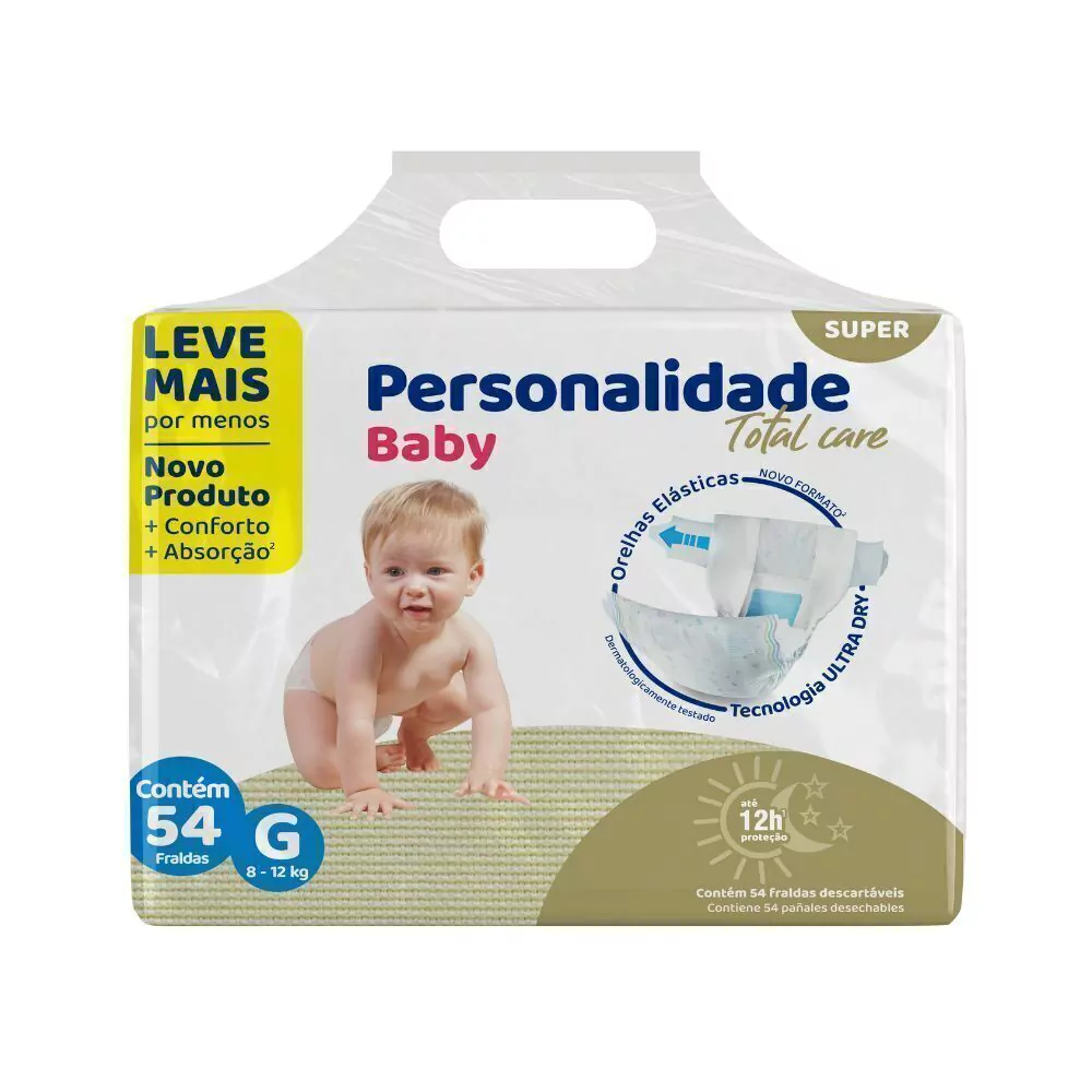 A Fralda Personalidade baby total care está de cara nova, novo produto, maior conforto, maior absorção, e agora com um formato que se adapta perfeitamente ao corpo do bebê, sua nova orelha elástica vem cumprindo um importante papel em sua totalidade, pois ela proporciona maior conforto e suavidade ao bebê, além de melhor ajuste ao corpo e seus movimentos.