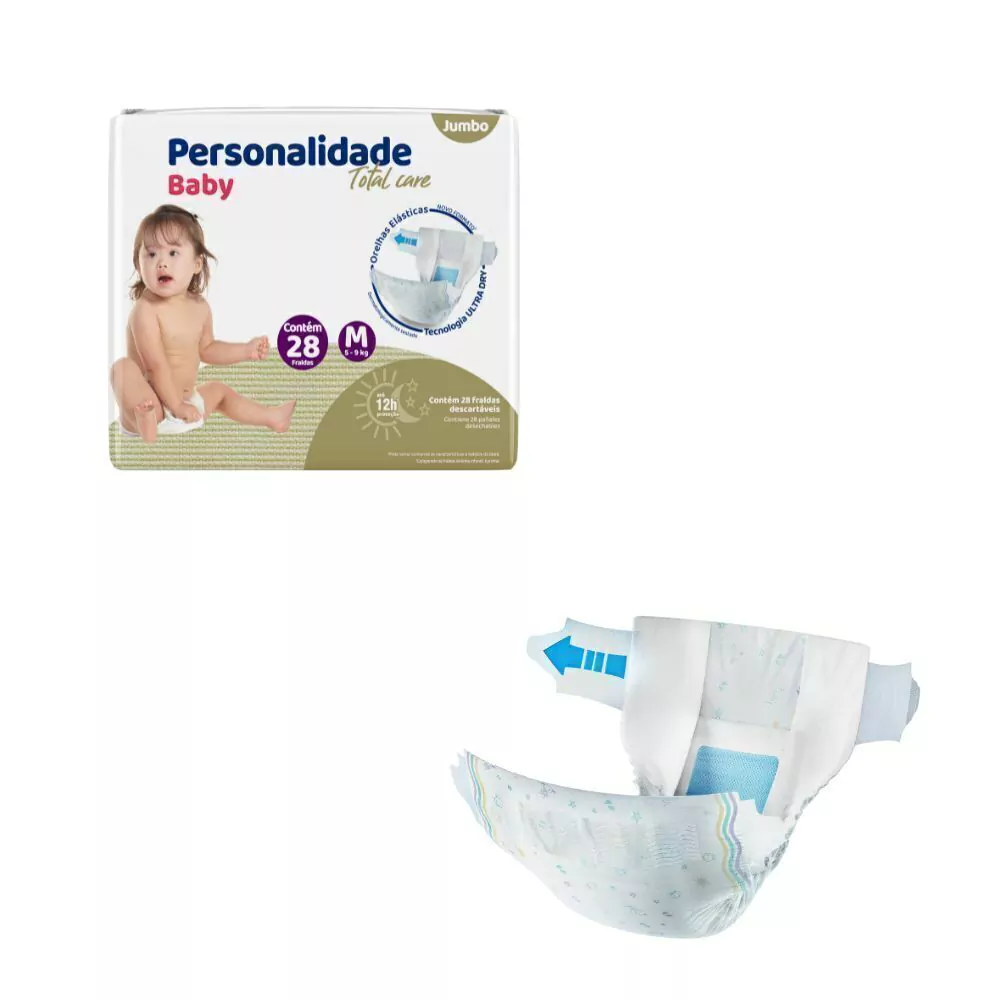 A Fralda Personalidade baby total care está de cara nova, novo produto, maior conforto, maior absorção, e agora com um formato que se adapta perfeitamente ao corpo do bebê,sua nova orelha elástica vem cumprindo um importante papel em sua totalidade, pois ela proporciona maior conforto e suavidade ao bebê, além de melhor ajuste ao corpo e seus movimentos.